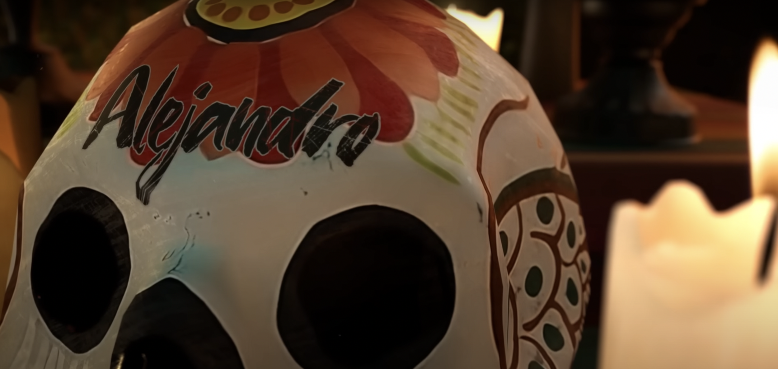 The full ofrenda is revealed. More SUGAR SKULLS sit prominently on the altar. CUT TO a TRACKING CLOSE-UP along the ofrenda. Each skull has a name on it – for each member of Task Force 141.